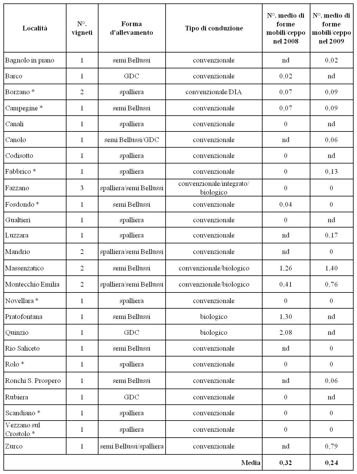 Seguendo il metodo Lessio-Alma dell’Università degli Studi di Torino, è stata stimata una densità di popolazione provinciale nel 2008 di 0,3 forme mobili per ceppo di vite (vale a dire qualcosa come 1 scafoideo ogni tre viti), osservando 16.100 foglie di 3.220 ceppi; mentre nel 2009 la densità è stata stimata in 0,2 forme mobili/ceppo, in seguito all’osservazione di 19.690 foglie su 3.937 viti. In tabella 2 sono riportati le località dei vigneti coinvolti, il loro numero, le forme d’allevamento, il tipo conduzione e il numero per i due anni di forme mobili di scafoideo per ceppo di vite della singola zona; con l’asterisco sono indicate le località in cui i vigneti sono gli stessi per entrambi gli anni.