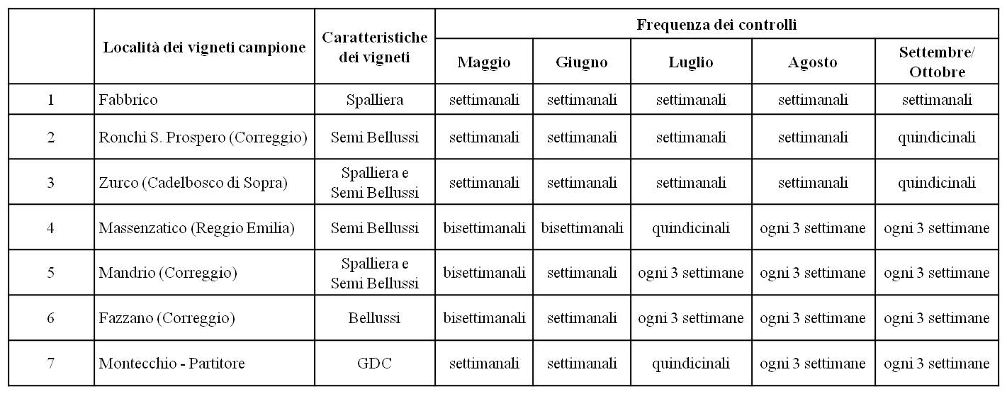 Tabella 1: i vigneti di monitoraggio per verificare il ciclo dello scafoideo